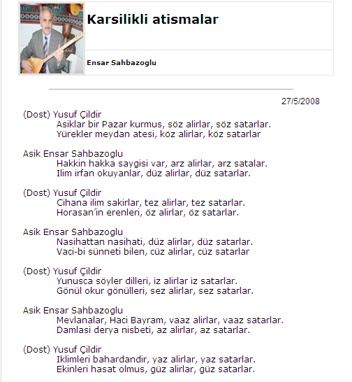 Dost Yusuf ve Aşık Ensar Şahbazoğlu atışmaları-Altın Anı Türk Musiki Derneği'nden Bahar Konseri-Kültür Müdürlüğü'nde konser-Aşıklardan nasihatlar-Yusuf Çıldır ve Ensar Şahbazoğlu karşılıklı atışmalar...
